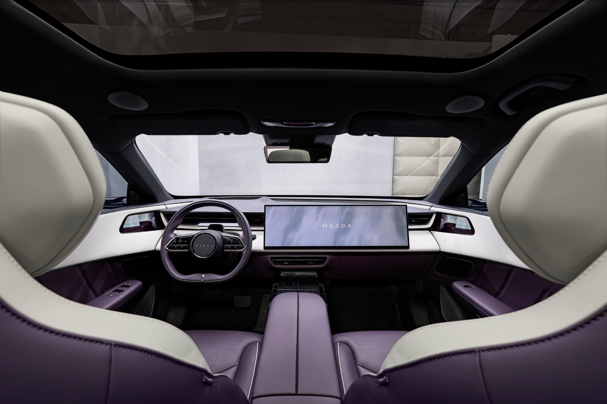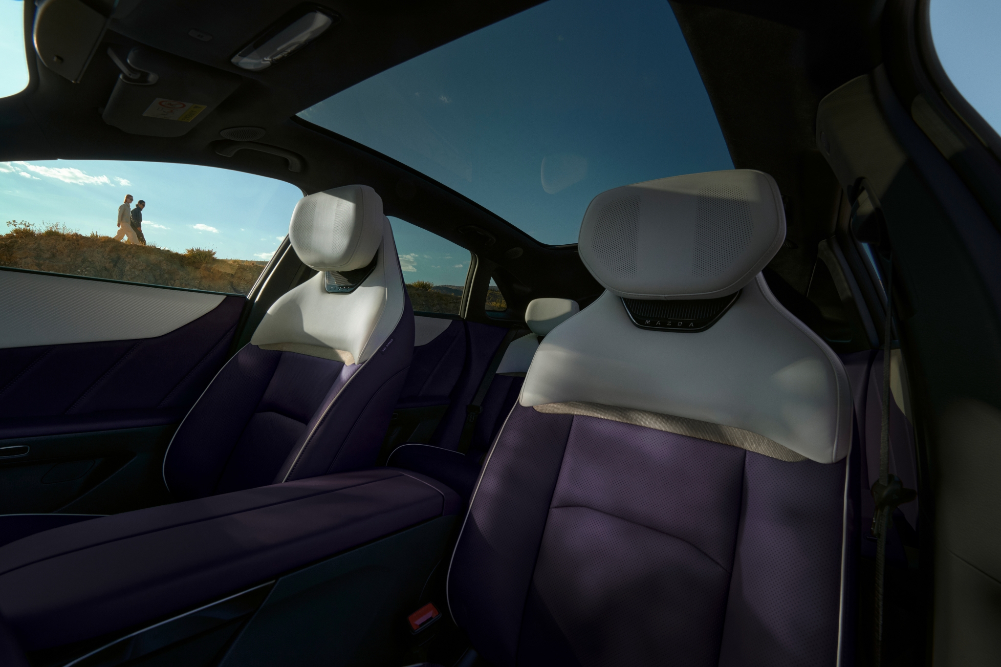 Interiøret fås i tre karakteristiske farvevarianter i et vegansk alternativ til læder, som Mazda kalder Maztex: Warm Beige eller sort til CX-6e Takumi eller tofarvet Amethyst/hvid til CX-6e Takumi Plus.